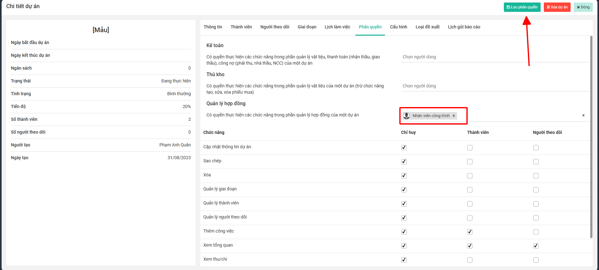 Chọn tab Phân quyền, nhập và chọn thành viên Quản lý hợp đồng, sau đó, bấm Lưu