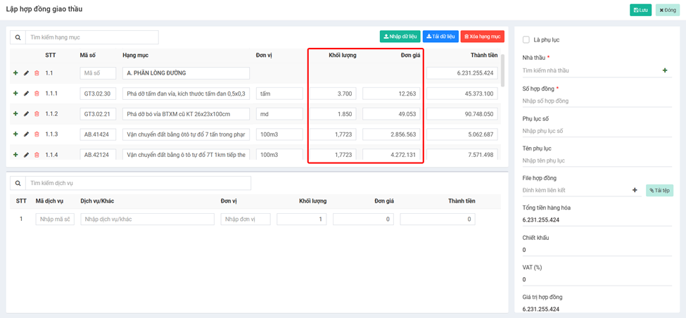 Cập nhật lại **Khối lượng** và **Đơn giá** theo hợp đồng giao thầu với nhà thầu phụ&#x20;