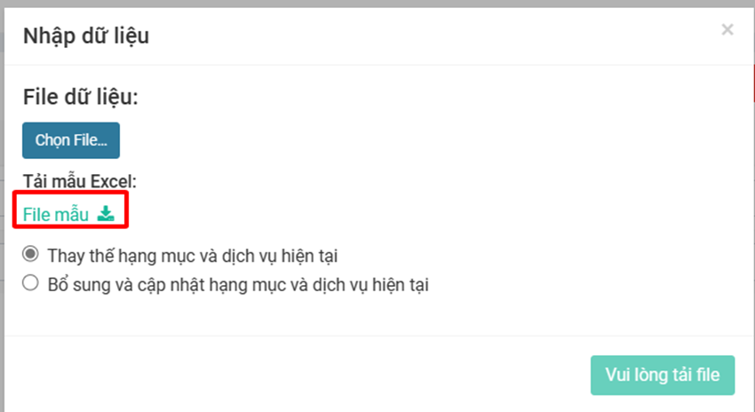 Chọn **Nhập dữ liệu**, sử dụng **File mẫu** đã có sẵn của bên FastCons
