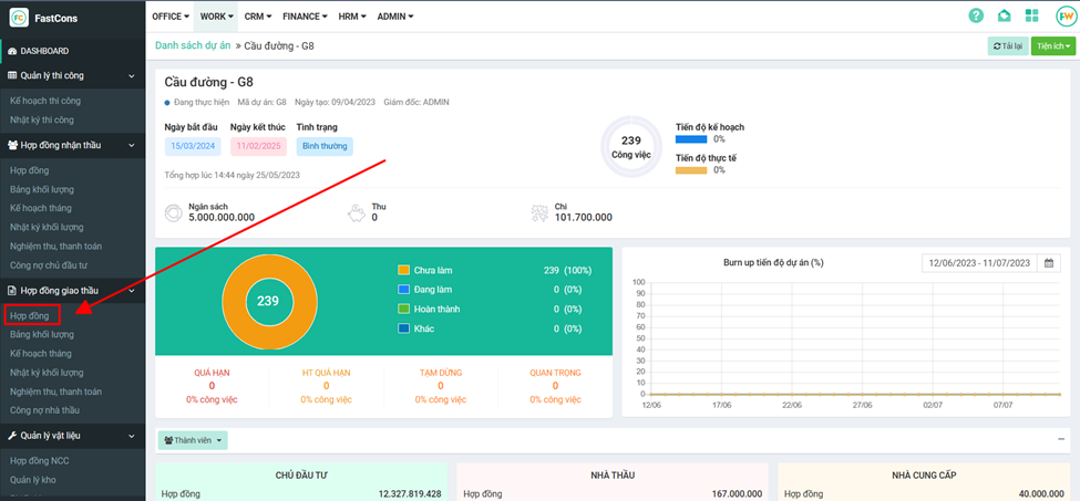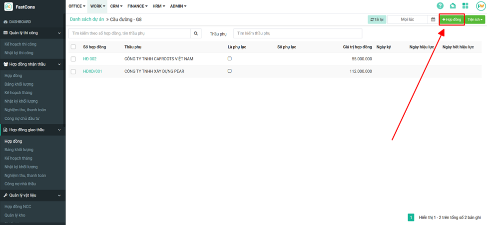 **Bước 1:** Tại giao diện dự án, mục **Hợp đồng giao thầu→Hợp đồng**&#x20;