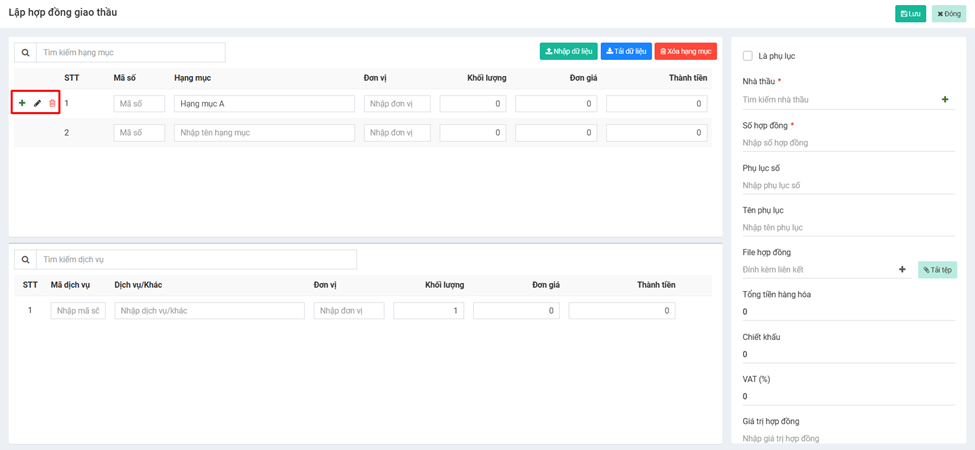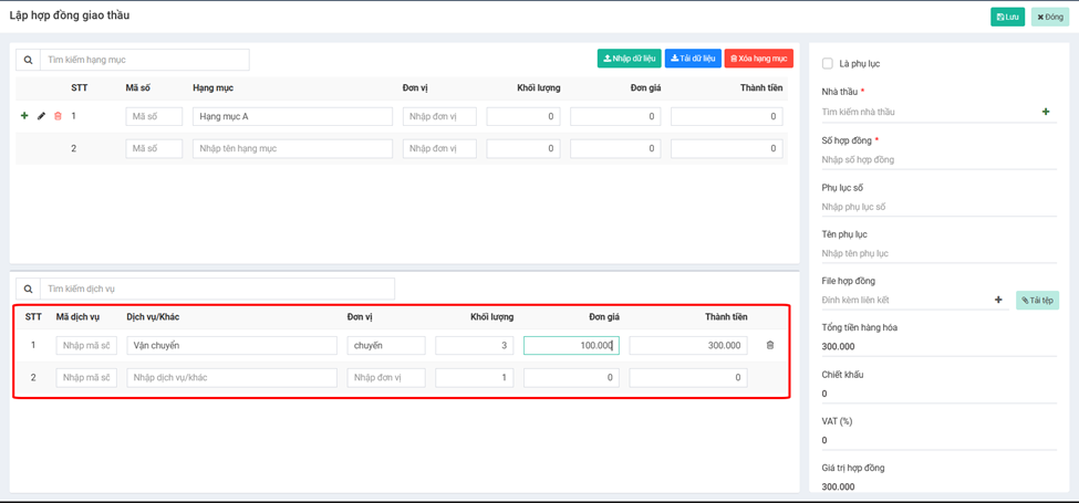 | ![](https://1690557839-files.gitbook.io/~/files/v0/b/gitbook-x-prod.appspot.com/o/spaces%2FPz1eJfqblQVy5h1urof5%2Fuploads%2Flt3gzhBw9Nx7SPfmdllY%2Fimage.png?alt=media\&token=22056c88-a045-4b28-97ad-b343d3a65af5) | <p>-  Đối với các hợp đồng là phụ lục của hợp đồng trước đó, tick phần Phụ lục và gán Hợp đồng trước đó vào</p><p></p><p>-  Nhà thầu: được link từ <strong>CRM→Khách hàng</strong> với phân loại <strong>Nhà thầu</strong></p><p>-  Số hợp đồng lưu trữ theo quy định công ty</p><p>-  Thông tin thêm về phụ lục</p><p></p><p>-  File đính kèm hoặc đường link liên kết</p><p>-  <strong>Tổng tiền hàng hoá</strong> bằng Tổng thành tiền theo hạng mục và dịch vụ</p><p></p><p>-  <strong>Chiết khấu</strong>: Theo VNĐ</p><p>-  <strong>VAT (%):</strong> Theo % <strong>Tổng tiền hàng hoá</strong></p><p></p><p>-  <strong>Giá trị hợp đồng</strong>: bằng <strong>Tổng tiền hàng hoá</strong> trừ <strong>Chiết khấu</strong> và cộng với giá trị <strong>VAT</strong></p><p></p><p></p><p>-  Thông tin thêm về hợp đồng</p><p></p><p></p><p></p><p>\*Hỗ trợ liên kết Nhật ký giao thầu với Nhật ký của bên nhận thầu</p> |