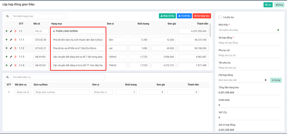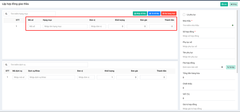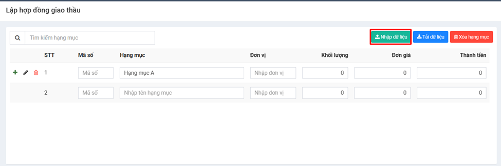 **b) Tạo trực tiếp các hạng mục giao thầu hoặc cập nhật bằng file Excel:**