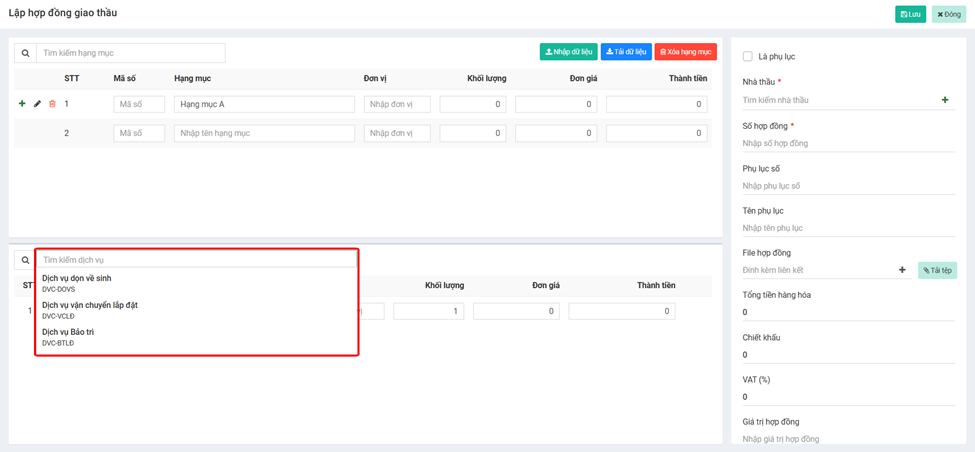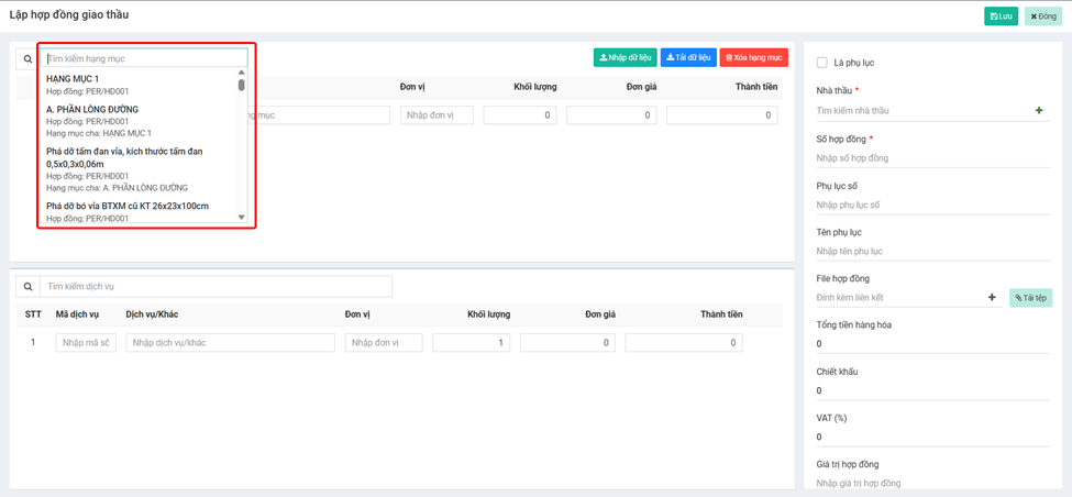 Tại thông tin hạng mục, Box **Tìm kiếm hạng mục** sẽ bao gồm các hạng mục có trong **Hợp đồng nhận thầu**&#x20;
