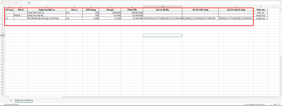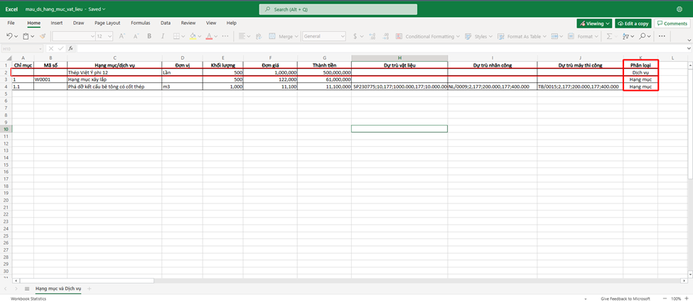 Cập nhật thông tin theo **File mẫu** của phần mềm. Đối với cập nhật theo thông tin hạng mục của **Hợp đồng nhận thầu**, cần cập nhật các cột danh mục giống bên **Hợp đồng nhận thầu**, bao gồm cả **chỉ mục**