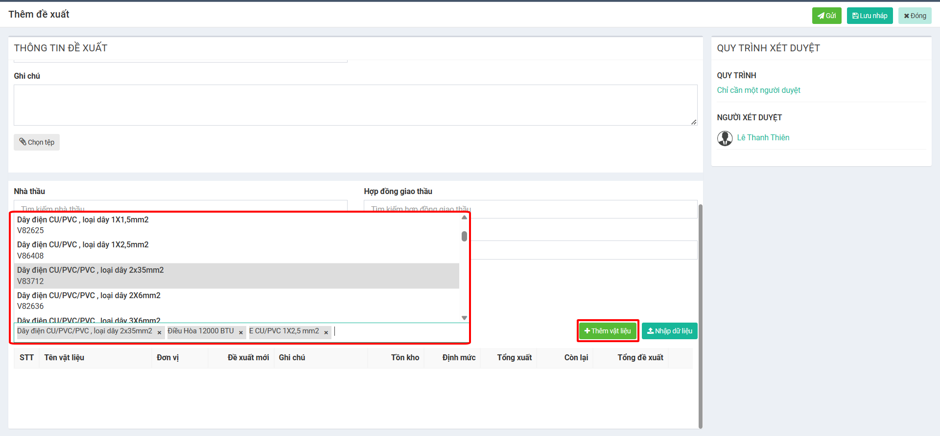 &#x20;Tại mục danh sách vật liệu, vào Box **Tìm kiếm vật liệu** và chọn vật liệu cần đề xuất, sau đó nhấn **+Thêm vật liệu**