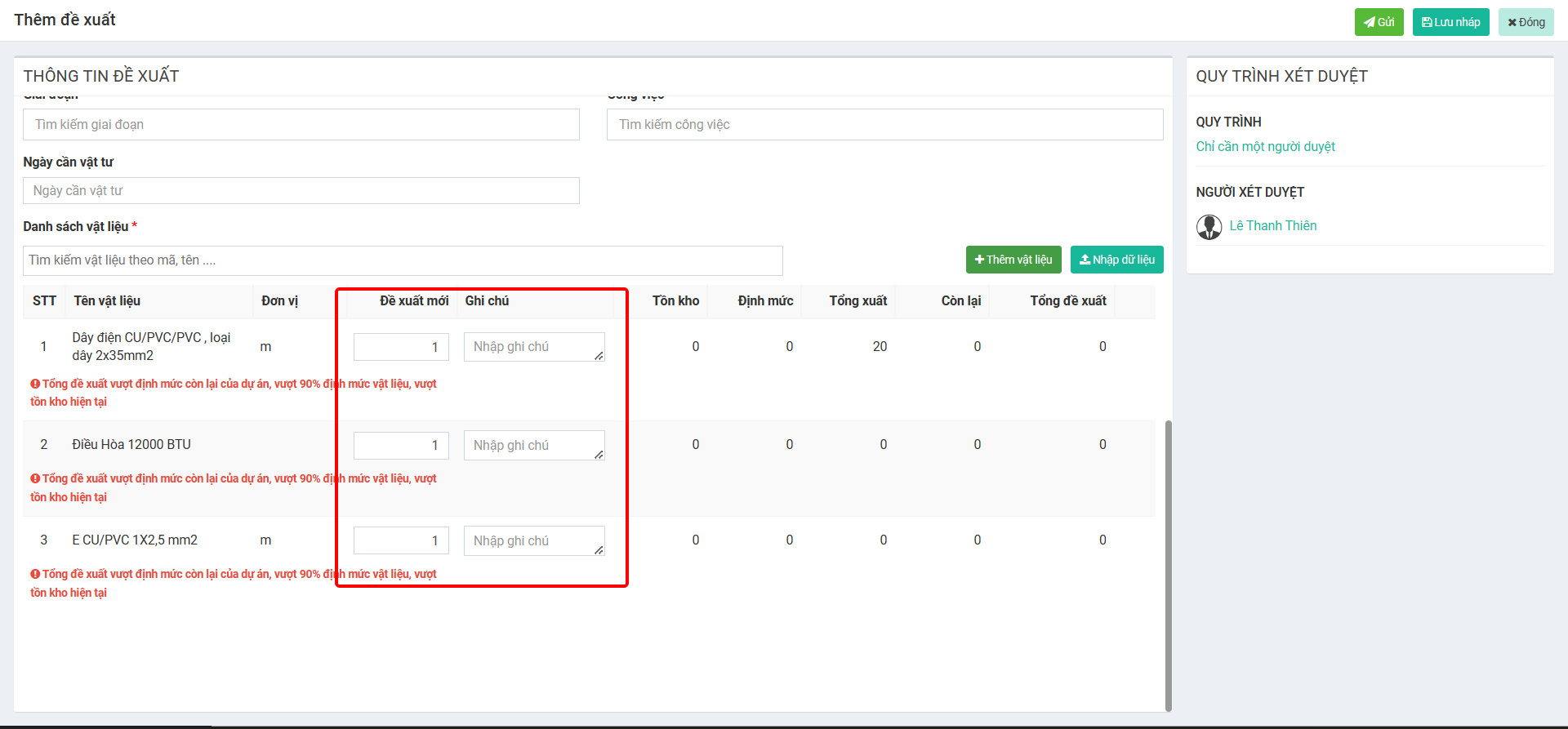 Cập nhật **số lượng** và các thông tin của vật tư đề xuất của từng vật liệu. sau đó nhấn **Gửi**