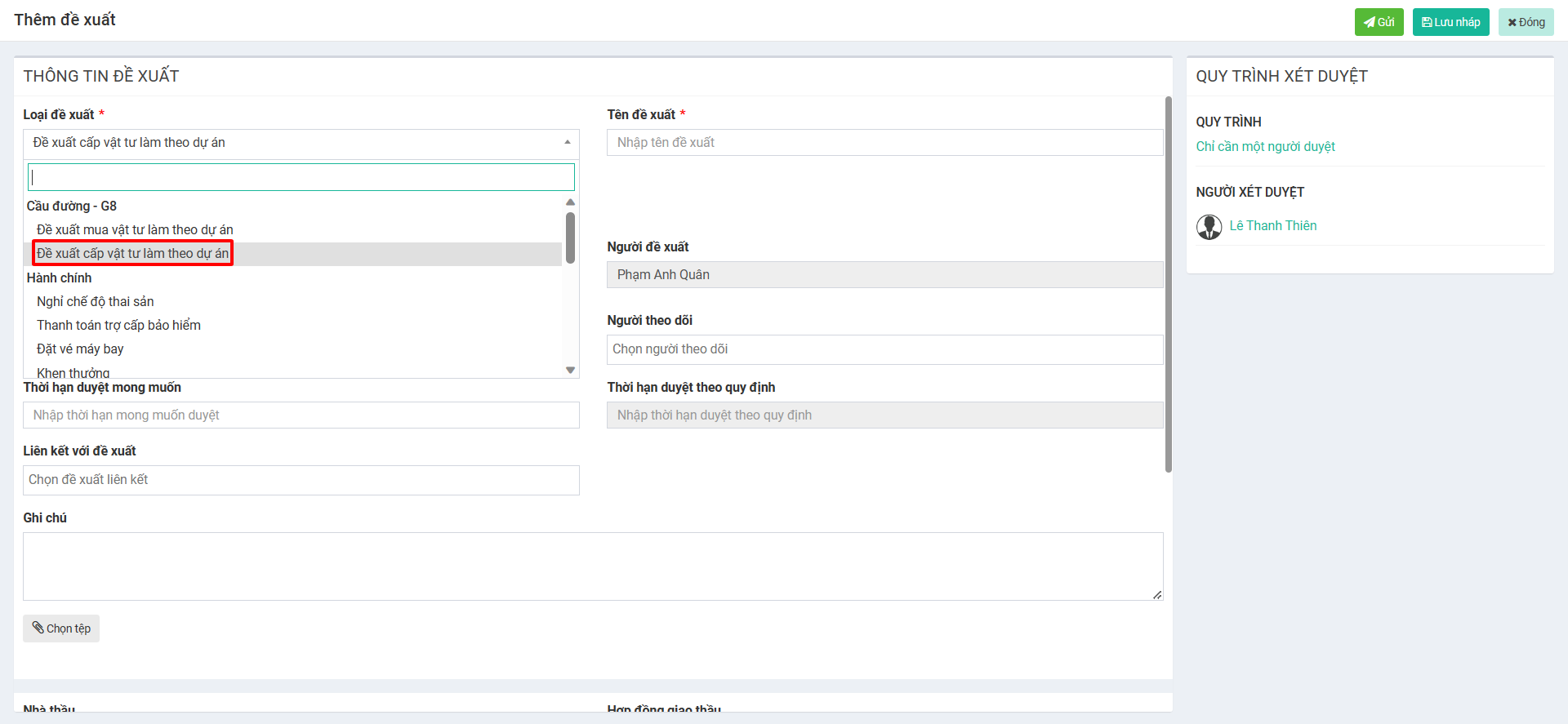 Giao diện tạo đề xuất sẽ hiện ra, chọn loại đề xuất **Đề xuất cấp vật tư theo dự án**