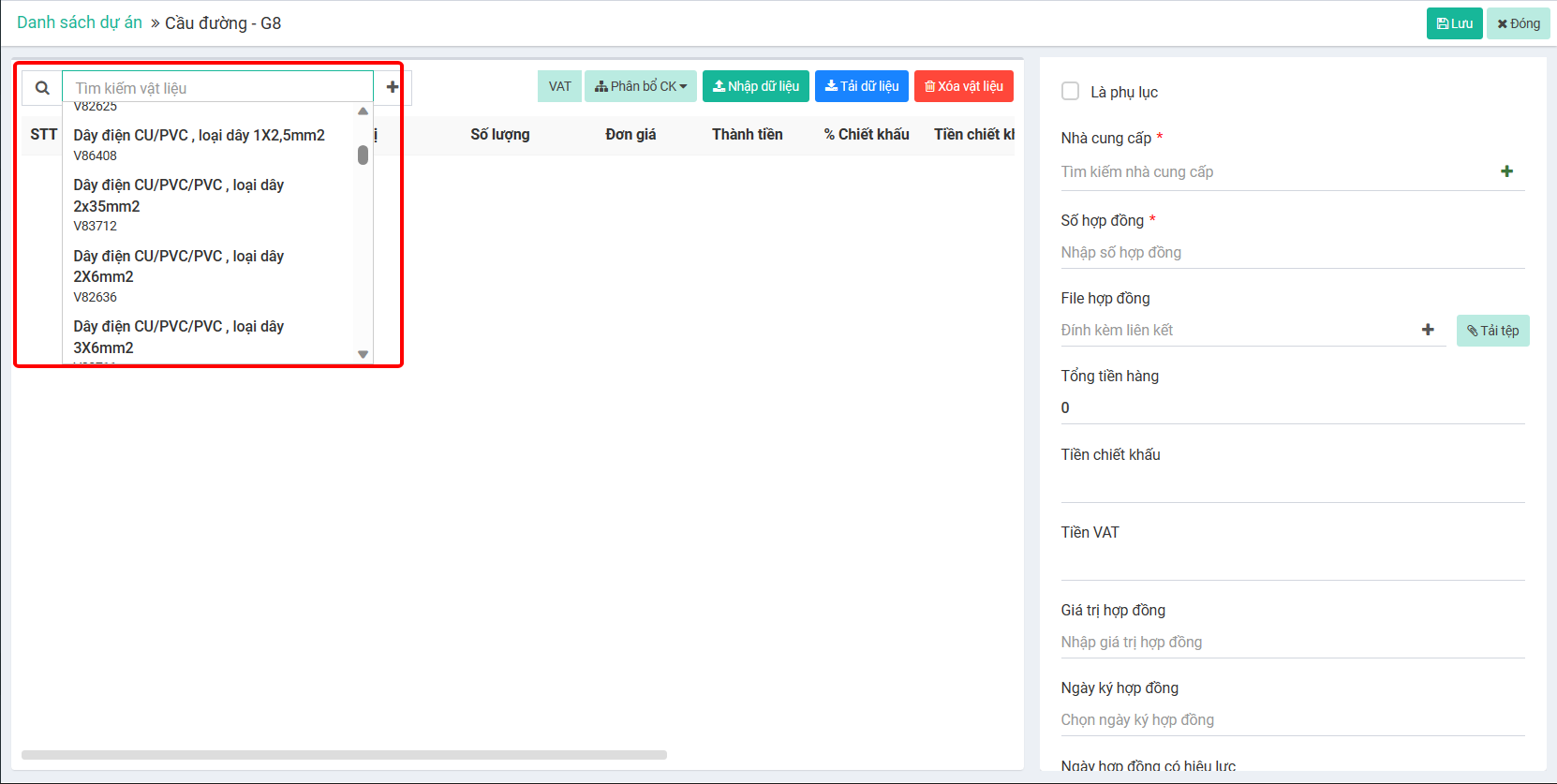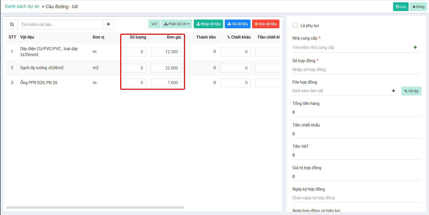 * **Tổng tiền hàng, Tiền chiết khấu, VAT** và **Giá trị hợp đồng** sẽ được tổng hợp từ thông tin vật liệu