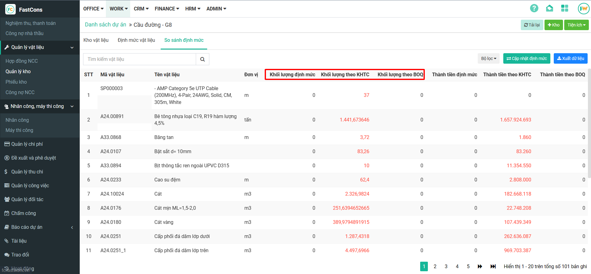 Tại đây, tab Kho vật liệu hỗ trợ việc theo dõi vật liệu (Định mức, Tổng nhập, Tổng xuất, Tổng hoàn, Tồn kho)