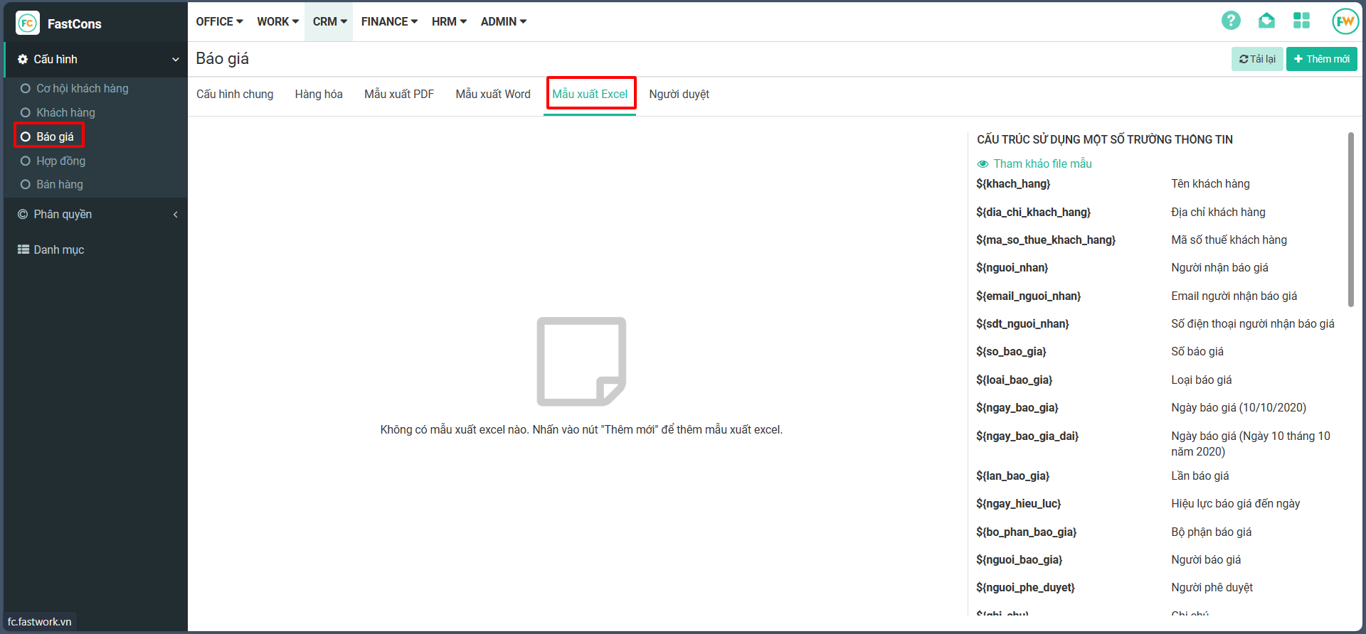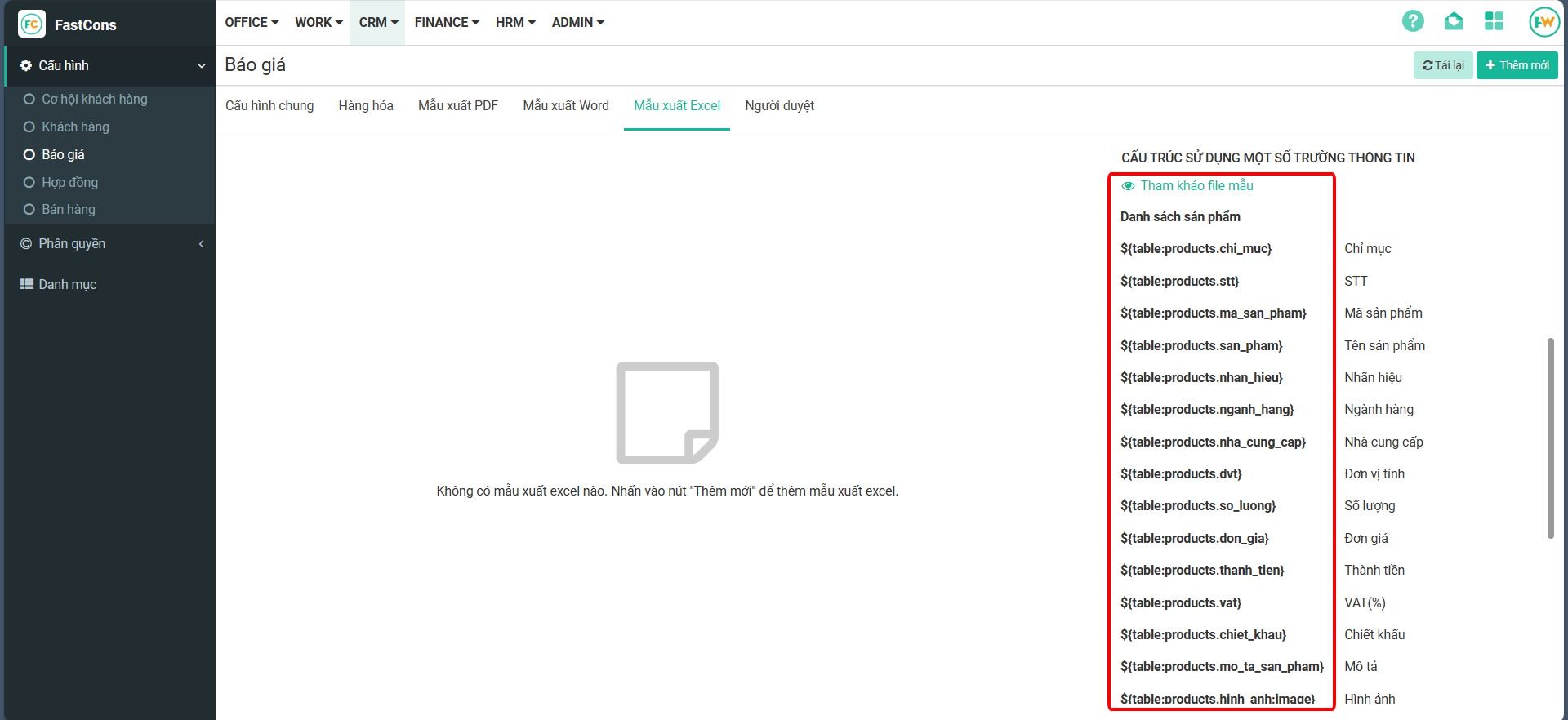 # Cấu hình mẫu xuất báo giá file exel
