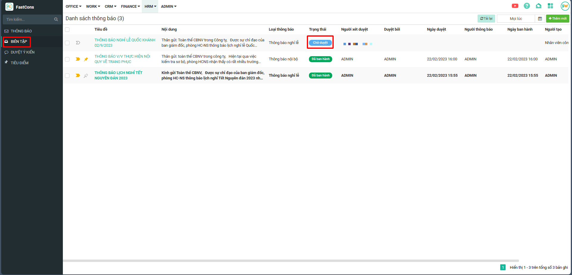 Bước 1 : Từ giao diện HRM → chọn Thông báo nội bộ.