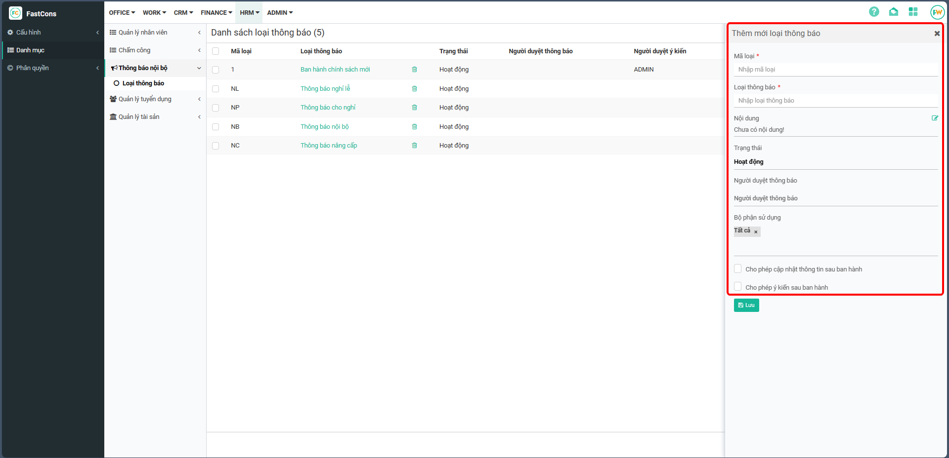 Sau khi nhập đủ thông tin → chọn Lưu để thực hiện lưu lại loại thông báo