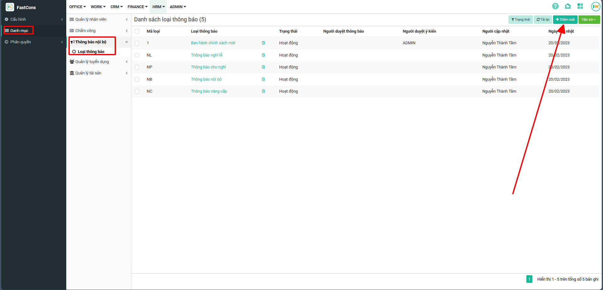 Bước 2 : Chọn Danh mục → chọn Thông báo nội bộ→ Chọn Loại thông báo → chọn Thêm mới