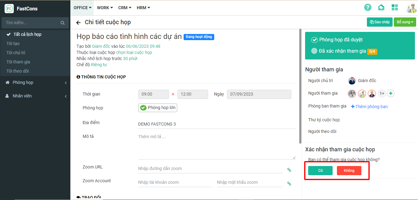 **\*Lưu ý:** Việc xác nhận tham gia lịch họp chỉ có ý nghĩa trước khi thời gian bắt đầu cuộc họp, mục đích thông báo cho quản lý số lượng thành viên tham gia vào cuộc họp đó. Nên sau khi thời gian bắt đầu cuộc họp thì sẽ không thể xác nhận tham gia cuộc họp nữa.